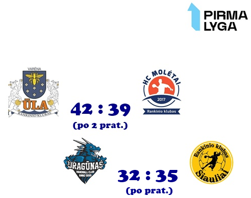Stipriausios Lietuvos vyrų rankinio pirmosios lygos komandos šeštadienį sirgaliams padovanojo du dramatiškus mačus, kurių nugalėtojai per pagrindinį laiką nepaaiškėjo. Varėnoje prasidėjusio finalo ketverto pusfinalio rungtynėse šeimininkė Varėnos „Ūla“ po dviejų pratęsimų nugalėjo „Molėtus“ 42:39 (16:12, 31:31, 36:36), o „Šiauliai“ po vieno pratęsimo įveikė Klaipėdos „Dragūno“ dublerius 35:32 (14:16, 28:28).