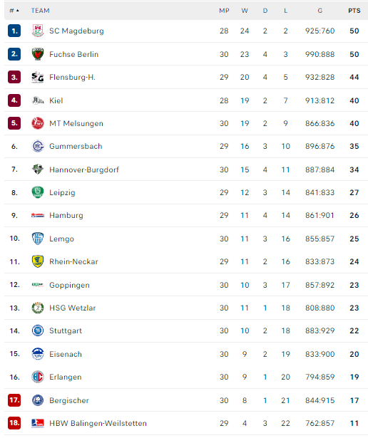 Pirmauja: „Magdeburg“ – 50, „Füchse“ – 50, „Flensburg“ – 44, „Kiel“ – 40, „Melsungen“ – 40, „Gummersbach“ – 35, … „Stuttgart“ – 22.