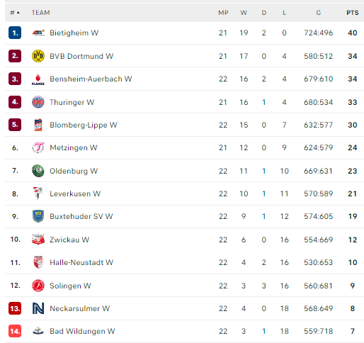Pirmauja: „Bietigheim“ – 40, „Borussia“, „Bensheim“ – po 34, „Thüringer“ – 33, … „Vipers“ – 8.