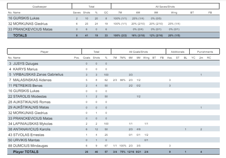 Rungtynių eiga: 0:1, 1:2, 4:2, 5:5, 8:8, 10:10, 10:12, 11:13; 14:15, 14:20, 17:22, 17:25, 18:27, 22:31, 25:32, 26:33.