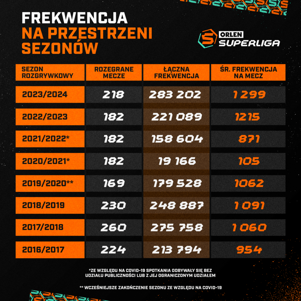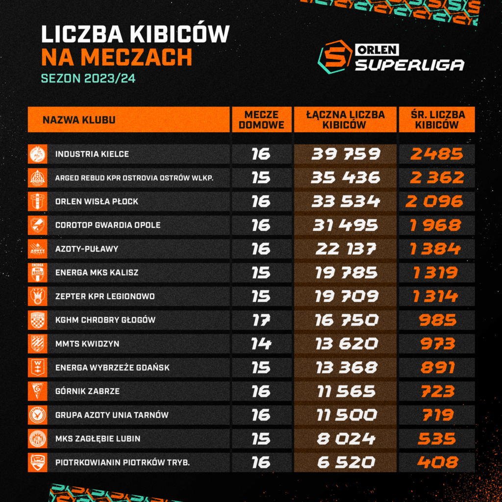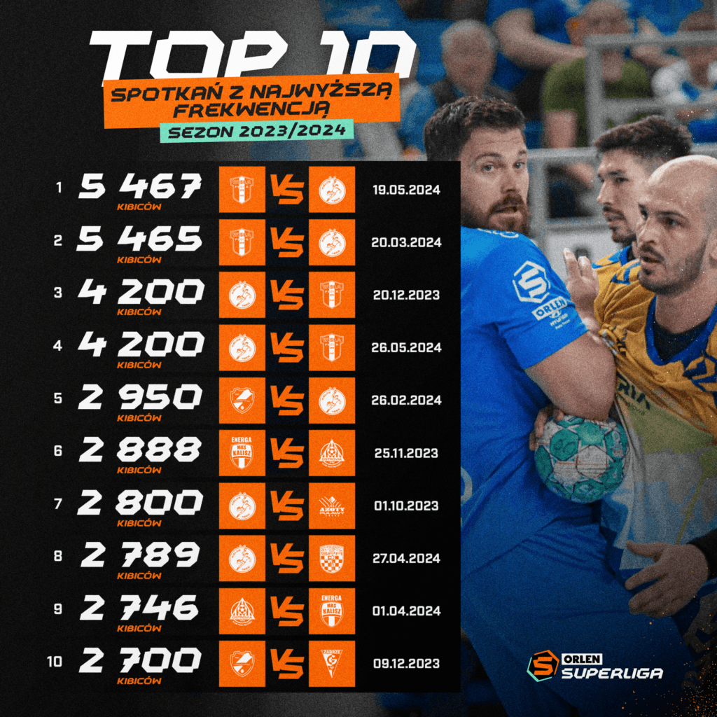 Lenkijos vyrų rankinio lyga paskelbė ką tik pasibaigusio 2023-2024 metų sezono lankomumo duomenis. Superlygos vadovai džiaugiasi rekordiniu žiūrovų skaičiumi – palyginti su praėjusiu sezonu jis padidėjo ketvirtadaliu.