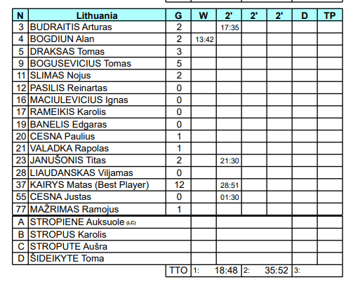 Lietuva – Latvija 31:43 (14:19). M.Kairys 12, Boguševičius 5, Drakšas 3, Budraitis 2, Bogdiunas 2, Slimas 2, Janušonis 2, P.Čėsna 1, Valadka 1, Mažrimas 1 / Serafimovičius 11, Kalninis 6.