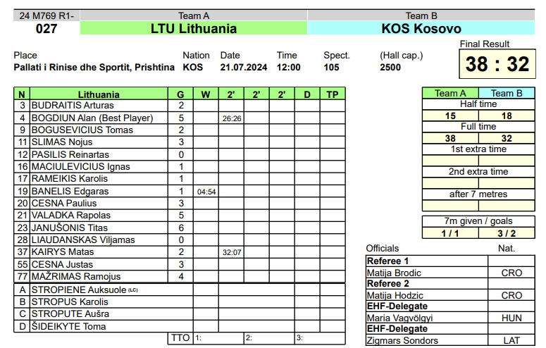 Lietuva – Kosovas 38:32 (15:18). Janušonis 6, Bogdiunas 5, Valadka 5, Mažrimas 4, Šlimas 3, P.Čėsna 3, J.Čėsna 3, Budraitis 2, Boguševičius 2, M.Kairys 2, Rameikis 1, Banelis 1 / Mulajas 8, Hajra 5.