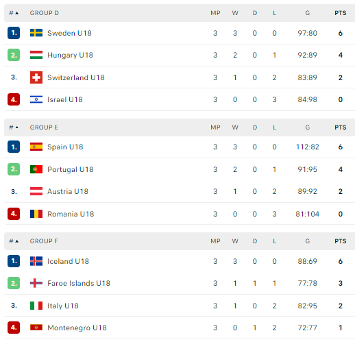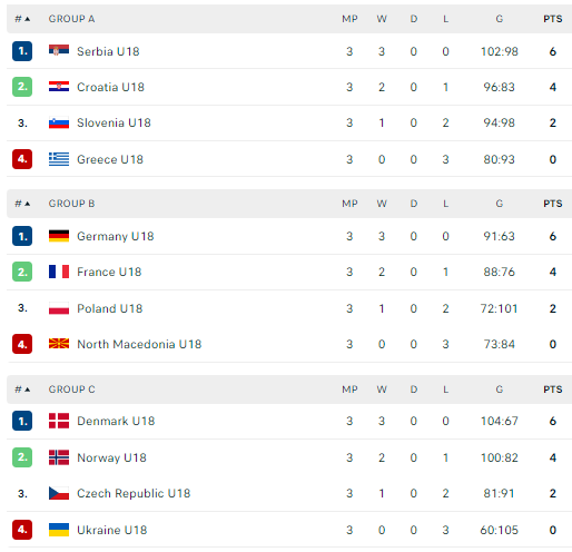 Grupių nugalėtojomis tapo po tris pergales pasiekusios Serbijos, Vokietijos, Danijos, Švedijos, Ispanijos ir Islandijos rinktinės. Į antrąjį grupių etapą, kaip geriausios antrąją vietą užėmusios komandos, taip pat pateko Norvegijos ir Vengrijos rinktinės.