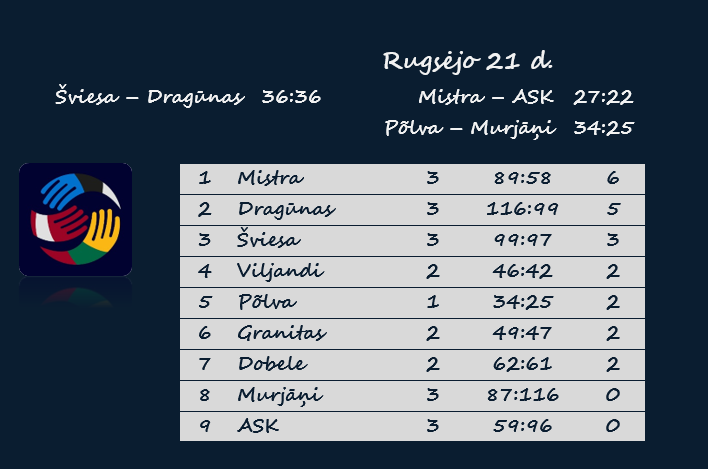 Tą pačią dieną Baltijos lygoje įvyko dar dvejos rungtynės, kuriose Estijos komandos namie nugalėjo Latvijos klubus: Talino „Mistra“ – Rygos ASK 27:22, Pylvos „Serviti“ – „Murjāņi“ 34:25.