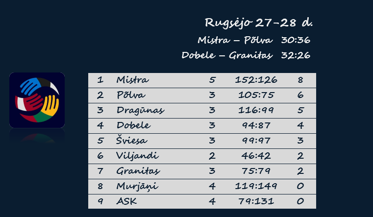 Penktadienį Baltijos lygoje žaidė dvi Estijos komandos. Jų rungtynėse Pylvos „Serviti“ išvykoje nugalėjo Talino „Mistra“ 36:30.