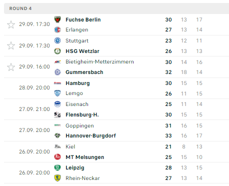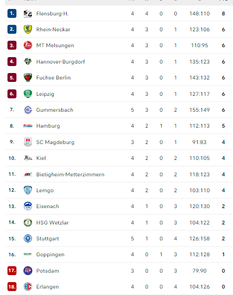 Pirmauja: „Flensburg“ – 8, „Rhein-Neckar“, „Melsungen“, „Hannover“, „Füchse“, „Leipzig“, „Gummersbach“ – po 6, … „Stuttgart“ – 2.