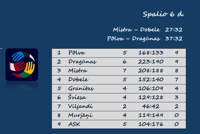 Talino „Mistra“ – Duobelės „Tenax“ 27:32 (15:13). Celminis 8, Orlovskis 6, Leppikas 5 / Pančenko 6, Kreicbergas 6, Juzupas 5.
