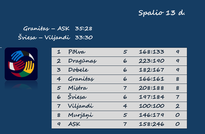 Lietuvos vyrų rankinio komandos savaitgalį laimėjo visas ketverias Baltijos lygos rungtynes su varžovais iš Estijos ir Latvijos. Namie žaidę Kauno „Granitas“ ir Vilniaus „Šviesa“ prie šeštadienį iškovotų pergalių sekmadienį pridėjo po dar du taškus. „Granitas“ įveikė Rygos ASK komandą 35:28 (14:15), „Šviesa“ – „Viljandi“ ekipą 33:30 (17:17).