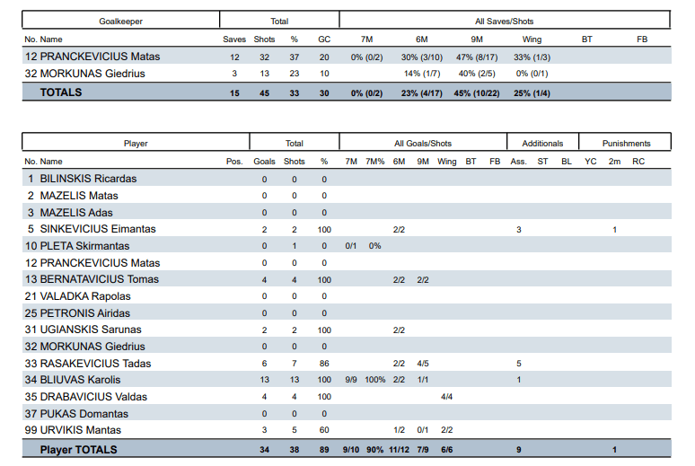 Rungtynių eiga: 3:0, 5:2, 5:7, 7:7, 8:10, 9:11, 12:11, 12:12, 16:12, 16:13; 21:17, 22:20, 24:23, 27:24, 27:27, 28:29, 34:29, 34:30.