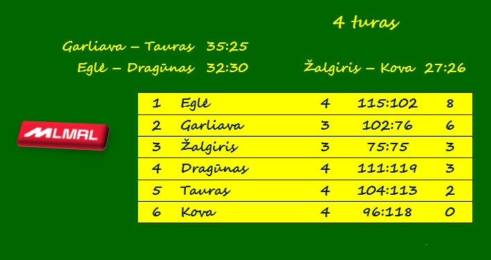 Lietuvos moterų rankinio lygos ketvirtajame ture visas trejas rungtynes laimėjo namie žaidusios komandos. Dvi iš jų šį rudenį dar neprarado nė vieno taško. Pirmąją vietą užimanti Vilniaus „Eglė“ šeštadienį įveikė Klaipėdos „Dragūną“ 32:30 (15:9), mažiau rungtynių žaidusi „Garliava“ nugalėjo Vilniaus „Taurą“ 35:25 (17:14). Atkakliausiose turo rungtynėse Kauno „Žalgiris“ palaužė Panevėžio „Kovą“ 27:26 (15:14).