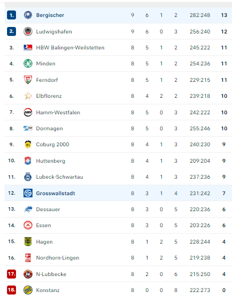 Pirmauja: „Bergische“ – 13, „Eulen“ – 12, „Balingen“, „Minden“, „Ferndorf“ – po 11, „Elbflorenz“ – 10, … „Grosswallstadt“ – 7, … „N-Lübbecke“ – 4.