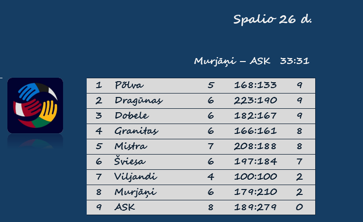 Vyrų rankinio Baltijos lygoje šį savaitgalį įvyko vienerios rungtynės, kuriose susitiko Latvijos komandos. Murjanių sporto gimnazijos rankininkai nugalėjo Rygos ASK ekipą 33:31.