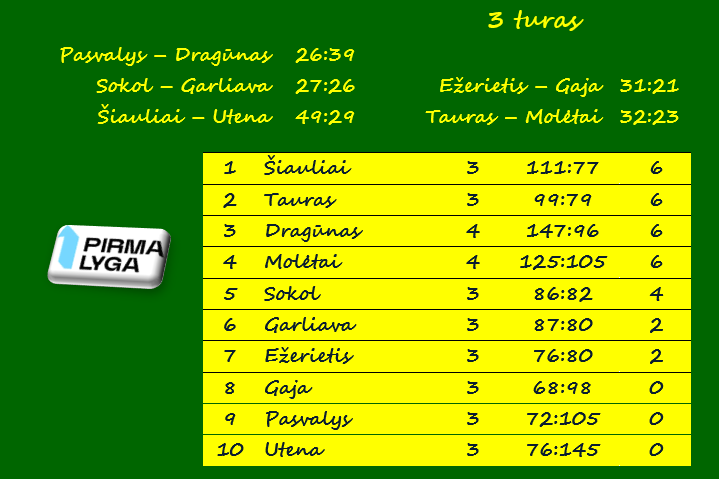 Po trijų turų pirmauja po 6 taškus surinkę „Šiauliai“, „Tauras“, „Dragūnas-2“ ir „Molėtai“. Tačiau klaipėdiečiai ir molėtiškiai jau žaidė po ketverias rungtynes.