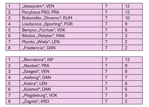 A grupėje po pirmojo rato pirmąją vietą dalijasi po 12 taškų iškovoję „Veszprém“ ir Paryžiaus PSG klubai. Nuo jų dviem taškais atsilieka Bukarešto „Dinamo“, trimis – Lisabonos „Sporting“.