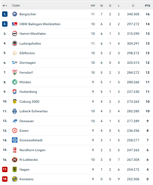 Pirmauja: „Bergische“ – 16, „Balingen“ – 14, „Hamm“, „Eulen“ – po 13, „Elbflorenz“ – 12, … „N.Lubbecke“ – 6.