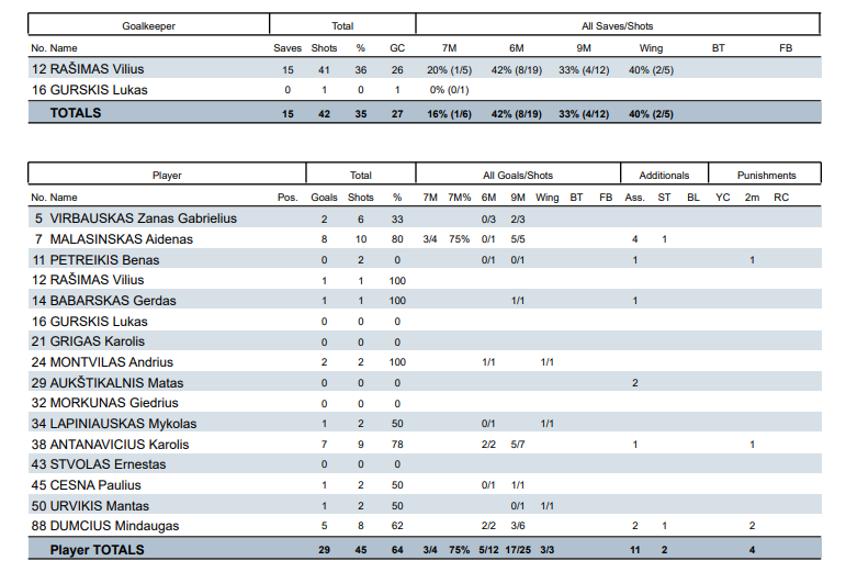 Lietuvos rinktinėje rezultatyviausiai žaidė Aidenas Malašinskas (8 įvarčiai), Karolis Antanavičius (7) ir Mindaugas Dumčius (5).
