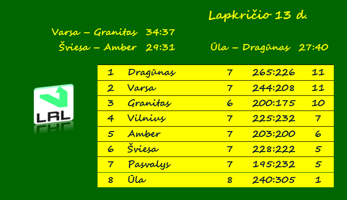 | Įvarčiai | 11 – Juozaitis, Varsa (su Granitu) | 13 – P.Čėsna, Dragūnas (su Ūla), Kasai, Pasvalys (su Dragūnu) |