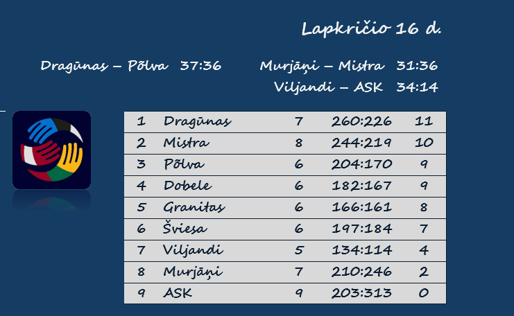 Kitose šeštadienį žaistose rungtynėse Estijos komandos įveikė Latvijos klubus. Rasiku „Mistra“ išvykoje nugalėjo Murjanių sporto gimnazijos komandą 36:31, o „Viljandi“ rekordiniu skirtumu 34:14 sutriuškino autsaiderę Rygos ASK ekipą.