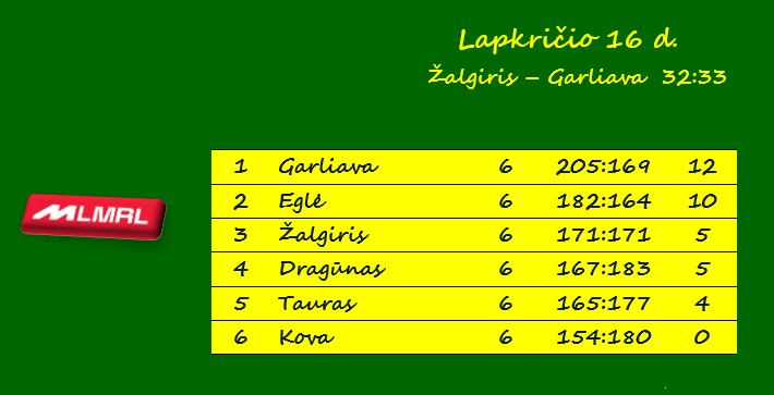 „Garliava“ surinko 12 taškų ir dviem taškais lenkia antrąją vietą užimančią Vilniaus „Eglę“. Šios dvi komandos jau smarkiai nutolo nuo kitų ekipų. Trečiąją vietą besidalijantys „Žalgiris“ ir Klaipėdos „Dragūnas“ turi dukart mažiau taškų negu „Eglė“ – po 5.