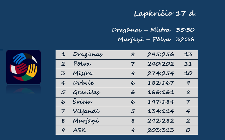 „Murjāņi“ – Pylvos „Serviti“ 32:36 (19:17).Kalninis 13, Šnepstas 6, Vaškevičius 5, Boras 5 / Timmo 8, Saksingas 6, Rooba 6, Rebane 5, Cholodiukas 5.