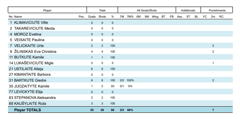 Lietuva: A.Ustilaitė 6, Bartkutė 6, Žilinskas 4, Kaušylaitė 3, Veličkaitė 2, Stepanova 2, Butkutė 1, Juozaitytė 1.