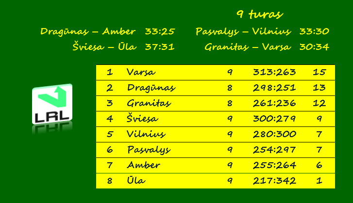 Po devintojo turo pirmauja 15 taškų iškovojusi „Varsa“. „Dragūnas“ surinko 13 taškų, „Granitas“ – 12 taškų, bet klaipėdiečiai ir kauniečiai žaidė mažiau rungtynių.