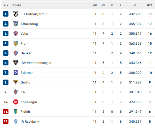 Pirmauja: FH, „Afturelding“ – po 17, „Valur“ – 16, „Fram“ – 15, „Haukar“ – 12, IBV – 11, „Strarnan“ – 10. .