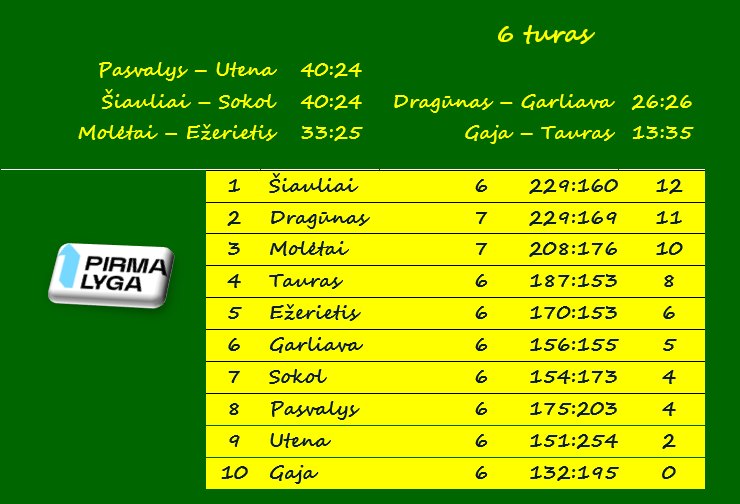 Lietuvos vyrų rankinio pirmojoje lygoje pergalingai žygiuojantys „Šiauliai“ tapo vienvaldžiais turnyro lyderiais. Šiauliečiai sekmadienį namie sutriuškino Šalčininkų „Sokol“ rankininkus 40:24 (25:8) ir pasiekė šeštąją iš eilės pergalę, o iki šio turo tiek pat taškų turėję Klaipėdos „Dragūno“ dubleriai nesugebėjo įveikti „Garliavos“.