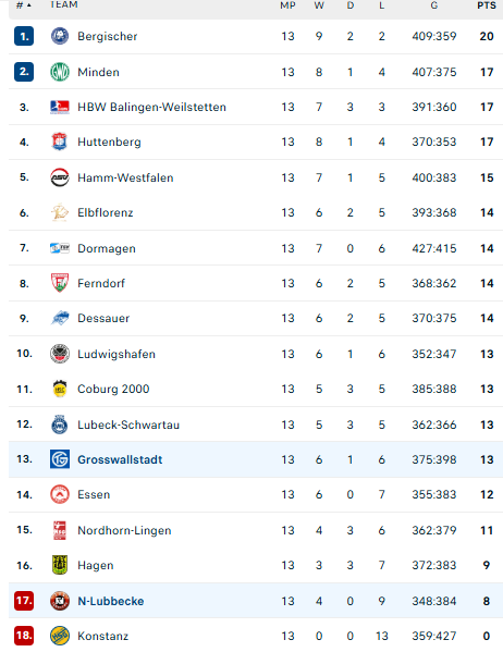 Pirmauja: „Bergische“ – 20, „Minden“, „Balingen“, „Hüttenberg“ – po 17, „Hamm“ – 15, „Elbflorenz“ – 14, … „Grosswallstadt“ – 13, … „N-Lübbecke“ – 8.