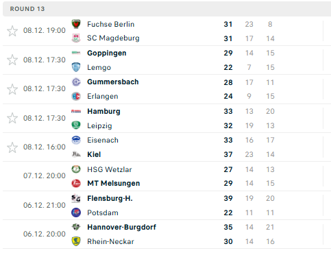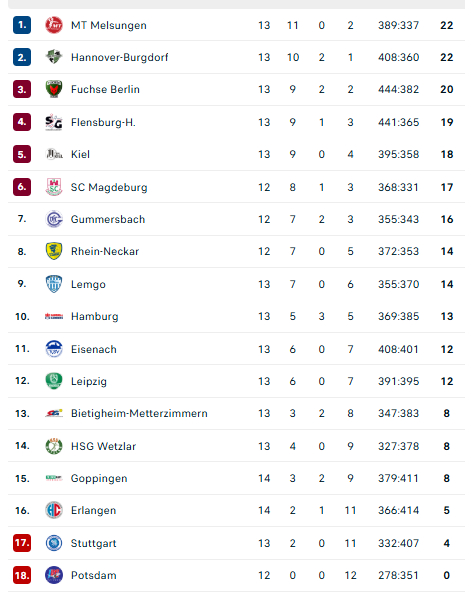 Pirmauja: „Bergische“ – 22, „Balingen“, „Hüttenberg“ – po 19, „Minden“ – 17, „Elbflorenz“ – 16, … „Grosswallstadt“ – 13, … „N-Lübbecke“ – 10.