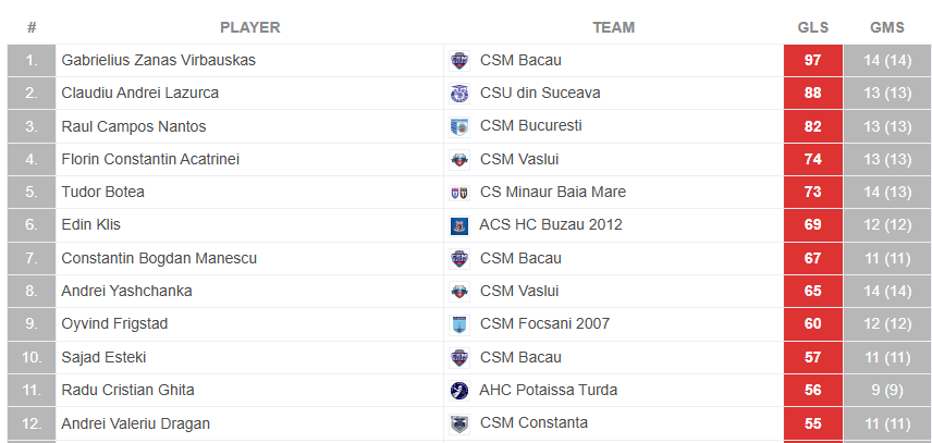 G.Virbauskas per 14 rungtynių įmetė 97 įvarčius ir yra rezultatyviausias Rumunijos lygos rankininkas. Antrąją vietą užimantis „Suceava“ žaidėjas Claudiu Lazurca per 13 rungtynių pelnė 88 įvarčius.