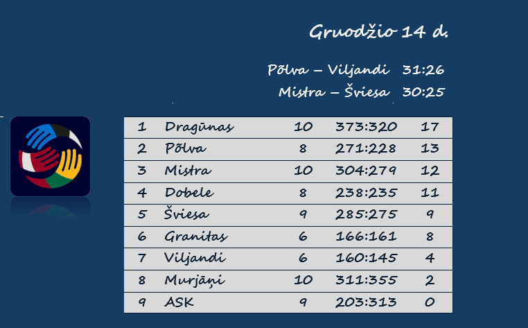 | Įmesti įvarčiai | 31 – Põlva | 45 – Dragūnas (su Murjāņi, su ASK) |
