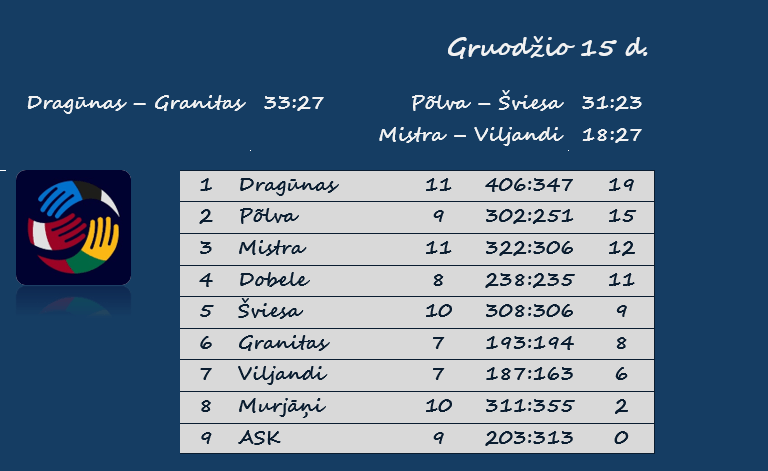 Sekmadienį taip pat susitiko dvi Estijos komandos. „Viljandi“ išvykoje sutriuškino Rasiku „Mistra“ rankininkus 27:18 (13:11).