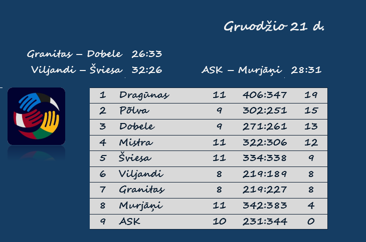 | Skirtumas | 7 – Dobele (su Granitu) | 20 – Mistra (su ASK), Dragūnas (su ASK), Viljandi (su ASK) |