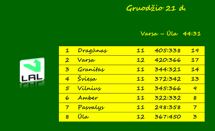 Antrąją vietą užimanti „Varsa“ truputį priartėjo prie lyderio Klaipėdos „Dragūno“. Klaipėdiečiai surinko 19 taškų per 11 rungtynių, alytiškiai – 17 taškų per 12 rungtynių.