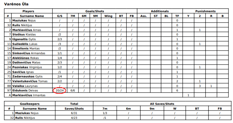 | Praleisti įvarčiai | 31 – Varsa (su Ūla) | 16 – Granitas (su Pasvaliu) |