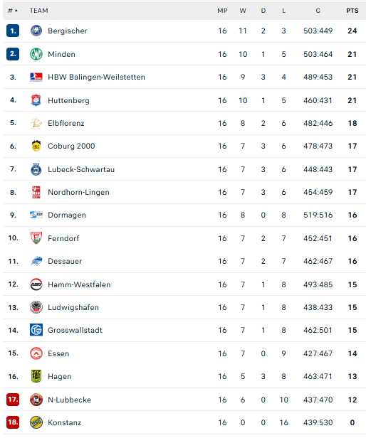 Pirmauja: „Bergische“ – 24, „Minden“, „Balingen“, „Hüttenberg“ – po 21, „Elbflorenz“ – 18, … „Grosswallstadt“ – 15, … „N-Lübbecke“ – 12.