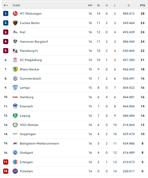 Pirmauja: „Melsungen“ – 28, „Füchse“, „Kiel“, „Hannover“ – po 24, „Flensburg“ – 22, „Magdeburg“ – 21, „Rhein-Neckar“ – 18, … „Stuttgart“ – 8.