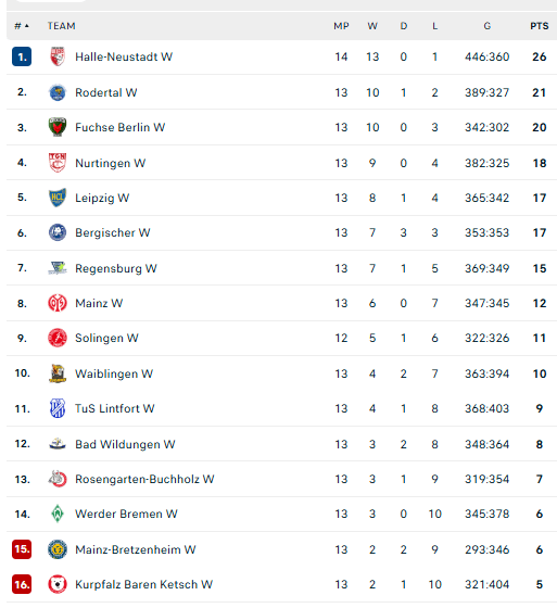 Pirmauja: Halės „Union“ – 26, „Rodertal“ – 21, „Füchse“ – 20, „Nurtingen“ – 18, … „Vipers“ – 8.