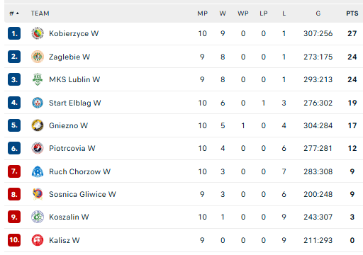 Pirmauja: „Kobierzyce“ – 27, „Zaglębie“, „Lublin“ – po 24, … „Piotrcovia“ – 12.
