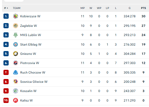 Pirmauja: „Kobierzyce“ – 30, „Zaglębie“ – 27, „Lublin“ – 24, … „Piotrcovia“ – 12.