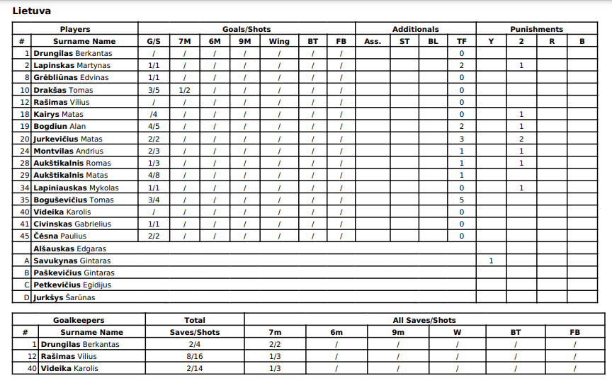 Lietuva: Bogdiunas 4, M.Aukštikalnis 4, Drakšas 3, Boguševičius 3, Jurkevičius 2, Montvilas 2, Čėsna 2, Lapinskas 1, Grėbliūnas 1, R.Aukštikalnis 1, Lapiniauskas 1, Civinskas 1.