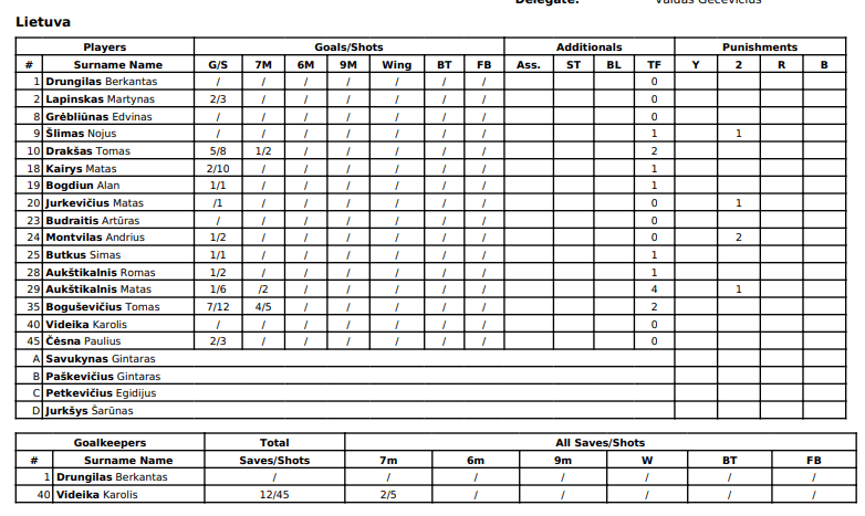 Lietuva: Boguševičius 7, Drakšas 5, Lapinskas 2, Kairys 2, Čėsna 2, Bogdiunas 1, Montvilas 1, Butkus 1, R.Aukštikalnis 1, M.Aukštikalnis 1.