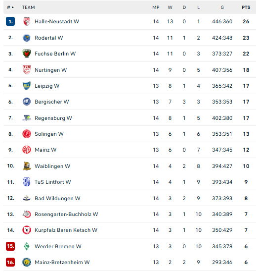 Lentelės kaimynėms pralaimėjusi Bad Vildungeno komanda užima dvyliktąją vietą tarp 16 ekipų.