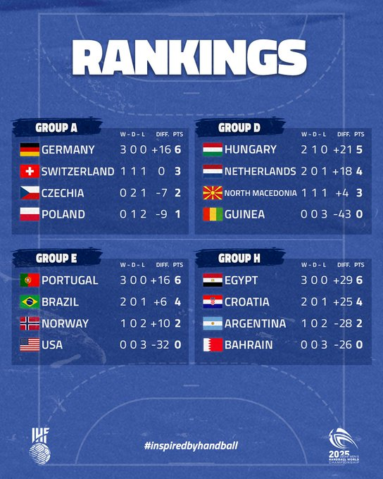 Pasaulio vyrų rankinio pirmenybėse sekmadienį keturių grupių komandos baigė pirmojo etapo varžybas. Šių grupių nugalėtojomis tapo Vokietijos, Vengrijos, Portugalijos ir Egipto rinktinės.