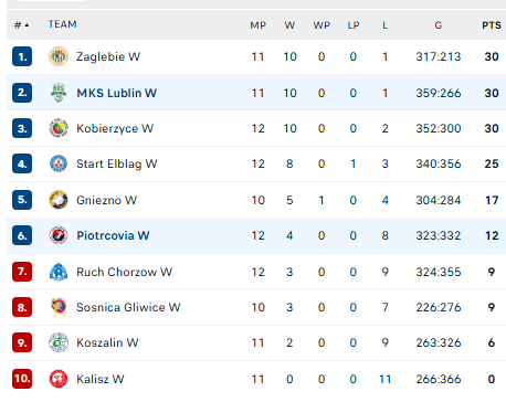 Pirmauja: „Zaglębie“, „Lublin“, „Kobierzyce“ – po 30, „Start“ – 25, „Gniezno“ – 17, „Piotrcovia“ – 12.