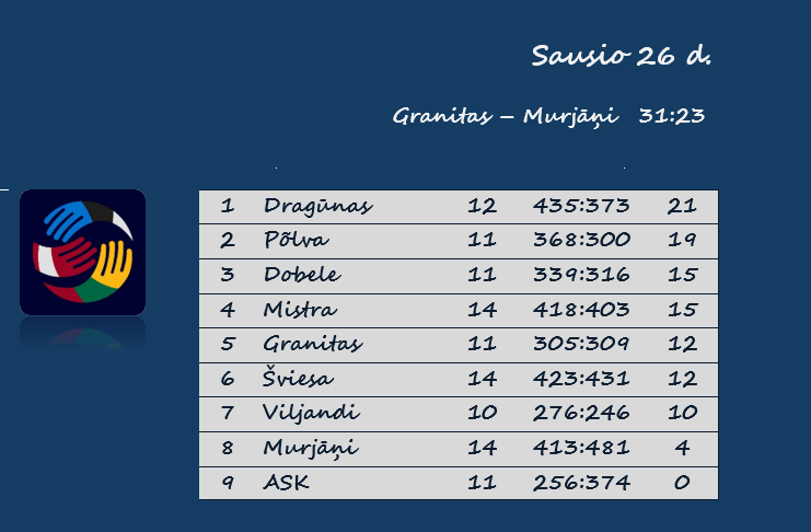 Kauno „Granitas“ – „Murjāņi“ 31:23 (13:9).