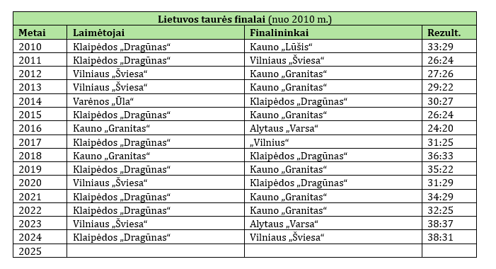 Beje, 2018 metais kauniečiai lemiamose rungtynėse nugalėjo klaipėdiečius. Po to šios komandos finale susitiko dar tris kartus – 2019, 2021 ir 2022 metais. Tuos tris kartus stipresnis buvo „Dragūnas“.