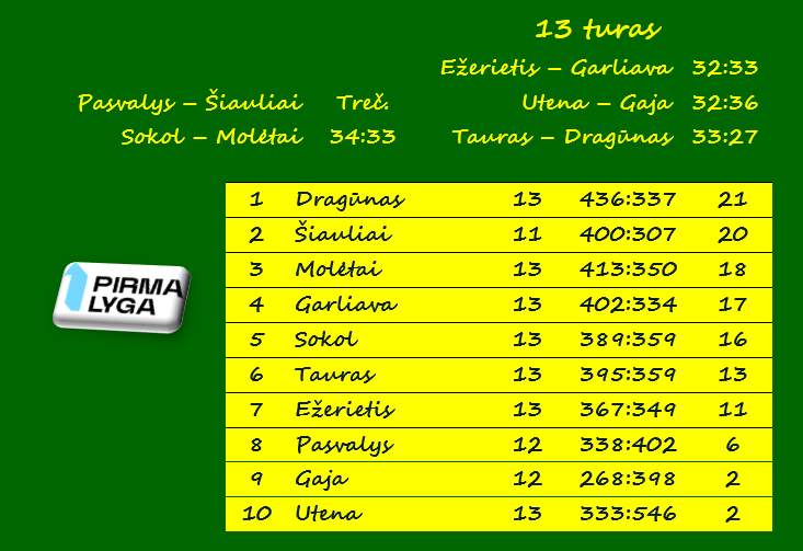 Prie „Dragūno“ priartėjo dvi komandos, iškovojusios pergales minimaliu skirtumu. Šalčininkų „Sokol“ namie nugalėjo „Molėtus“ 34:33 (18:14), „Garliava“ išvykoje įveikė Zarasų „Ežerietį“ 33:32 (17:17).
